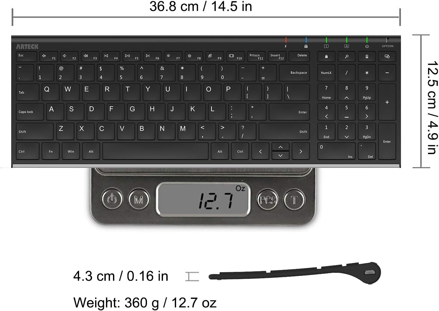 With a compact design (14.5 x 4.9 x 0.6 inches) and weighing only 12.7 oz, this keyboard is thin, portable, and space-saving β yet still features full-size keys, a number pad, and shortcut functions for efficient typing.